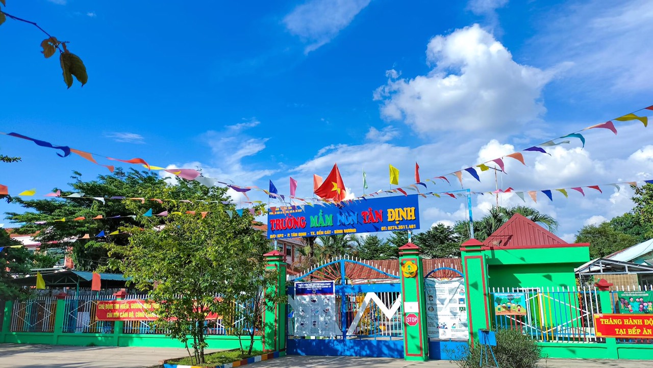 Trường Mầm Non Tân Định nằm trên Quốc lộ 13 thuộc khu phố 2 Phường Tân Định, Thị xã Bến Cát , tỉnh Bình Dương. Trường được thành lập năm 1998 và tách ra từ trường Tiểu học Tân Định. trường đạt chuẩn Quốc gia mức độ 1 năm 2008, đạt kiểm định chất lượng giáo dục cấp độ 3 năm 2016, và tái công nhận chuẩn Quốc gia mức độ 1 năm 2018. Trường có khuôn viên rộng 3.693 m2, với cảnh quang sạch đẹp, thoáng mát, và được trang bị cơ sở vật chất tương đối đầy đủ có các phòng chức năng và trang thiết bị phục vụ nhu cầu dạy và học cho các cháu. ...